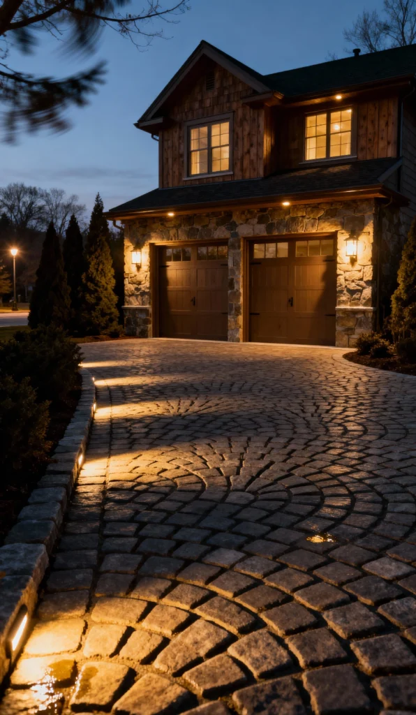 This cobblestone driveway is gorgeous, laid in a fan-like, radiating pattern that adds so much visual interest. But what really makes this stand out is the lighting. The low, inset lights along the stone border cast a warm, dramatic glow on the textured pavers, highlighting the pattern and ensuring a safe, stylish path to the cozy-looking house. The combination of the warm lights and the rustic stone and wood home exterior is just perfect for an evening arrival.