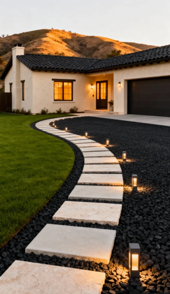 Talk about a striking entrance! The light-colored stepping stones create a beautiful, curved path against the backdrop of dark, black gravel. This contrast is so modern and clean. The path is expertly lit by minimalist, rectangular bollard lights, leading the eye straight to the warm glow of the home’s windows and door. The simple, low-maintenance landscaping with green grass adds another pop of color, making this a fantastic example of contemporary outdoor design.