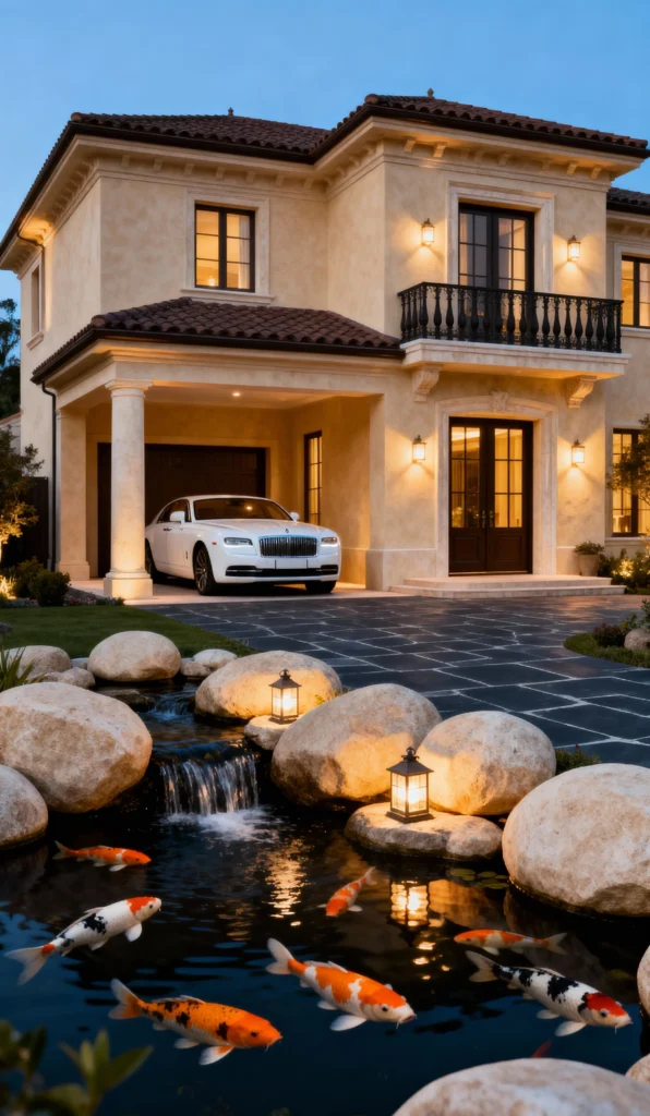 What a truly unique and tranquil entrance! Who wouldn’t want to arrive home to this? The feature here is definitely the koi pond with large river rocks and a gentle waterfall right off the driveway. The swimming koi and the warm glow of the lanterns make this a serene, welcoming area. The paved driveway leads up to a handsome, Mediterranean-style home with a covered portico, seamlessly blending luxury with natural beauty.