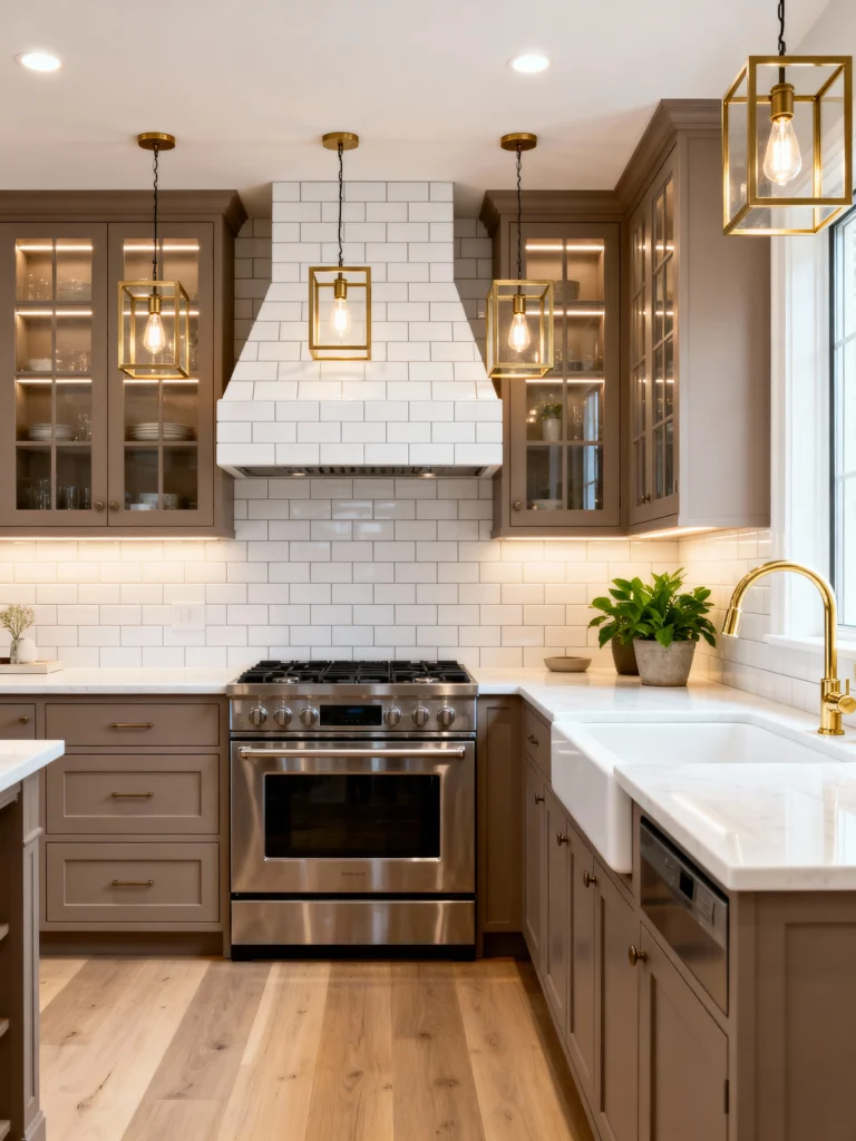 If you’re into a look that’s current, classic, and calming all at once, you’ve found it. These cabinets are painted in a perfect, muted taupe-gray, offering a soft, contemporary contrast to the bright white subway tile backsplash. But the real sparkle comes from the brass! The caged pendant lights and the stunning brass faucet over the farmhouse sink instantly elevate the entire space. Notice how the glass cabinet doors on top keep things feeling open and airy? The whole design is so balanced: the warm wood floor grounds the space, while the brass adds a touch of refined luxury. It’s chic, functional, and definitely a look I’m stealing ideas from!