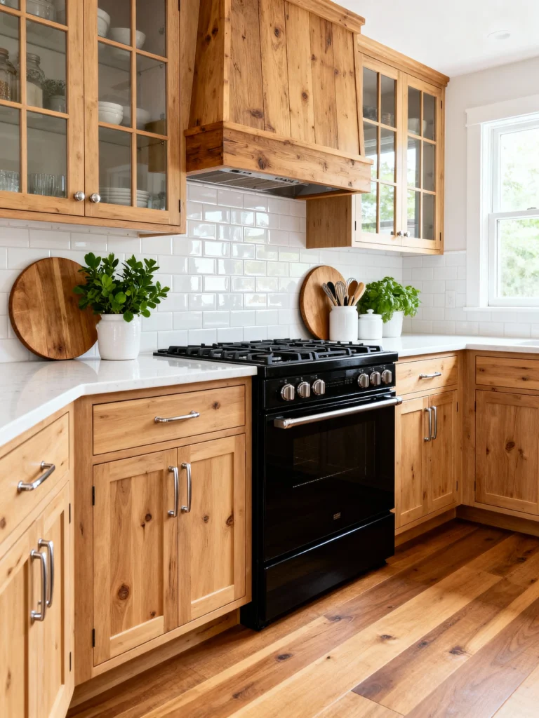 This kitchen is like a cozy cabin retreat right in your home! The knotty wood grain in those cabinets, floor, and especially the custom-paneled range hood just radiates warmth and character. It’s such an organic, earthy feel. To keep all that beautiful wood from feeling too heavy, they used a sparkling white subway tile backsplash and a bright white countertop—a perfect contrast! The modern black range keeps the design from feeling too traditional, and I love the glass fronts on the upper cabinets for displaying dishes. This design is all about texture and natural beauty; it’s inviting, relaxed, and beautifully done.