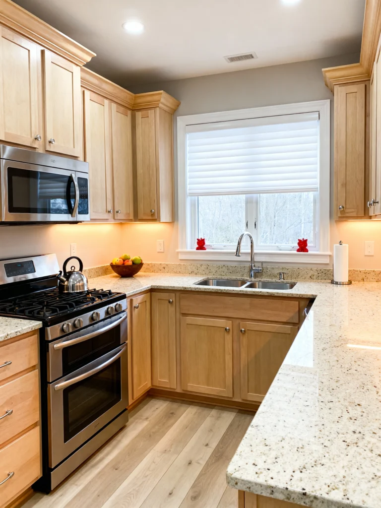 This kitchen has such a cheerful, inviting feel. The natural maple or birch cabinets are a classic choice and offer a lovely, light wood tone. They paired it with a speckled, light-colored granite countertop that really brightens up the space—it looks like beach sand! Stainless steel appliances, like that double-oven range, provide a nice modern touch. My favorite detail is the subtle under-cabinet lighting, which adds a beautiful glow to the countertop and highlights the warm tones of the wood. It’s a practical, comfortable, and family-friendly space!