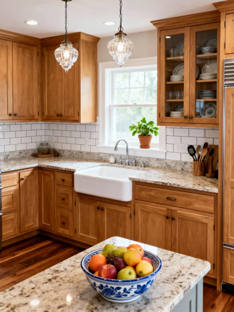 This is the definition of a warm, timeless kitchen. The medium-toned wood cabinets have a rich, traditional appeal that works beautifully with the white elements. The large apron-front (or farmhouse) sink is an absolute dream, set against a classic white subway tile backsplash. The speckled granite countertop pulls everything together, bringing in shades of brown, gray, and white. The glass-front cabinet is perfect for showing off your prettiest dishes, and those vintage-style glass pendant lights add such a lovely touch. It just screams “home” and makes me want to bake something immediately!