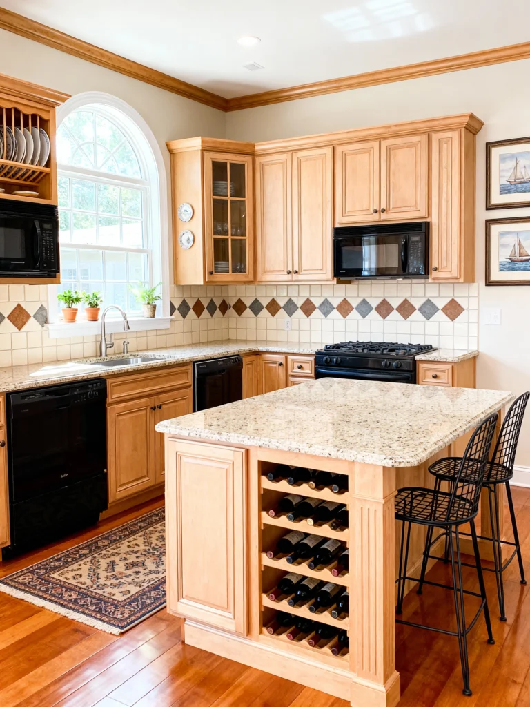 This kitchen has a lovely, classic charm! The light wood cabinets are accented by a gorgeous, arched window over the sink, which is a fantastic focal point. The backsplash is super interesting, featuring a mix of plain white tile and patterned diamond tiles in warm, earthy colors—it adds so much character! But the main attraction is the kitchen island with its built-in wine rack. It’s practical, looks fantastic, and the light granite countertop on the island is a great place to pull up a stool. It’s a cozy, well-loved space that feels perfect for entertaining!