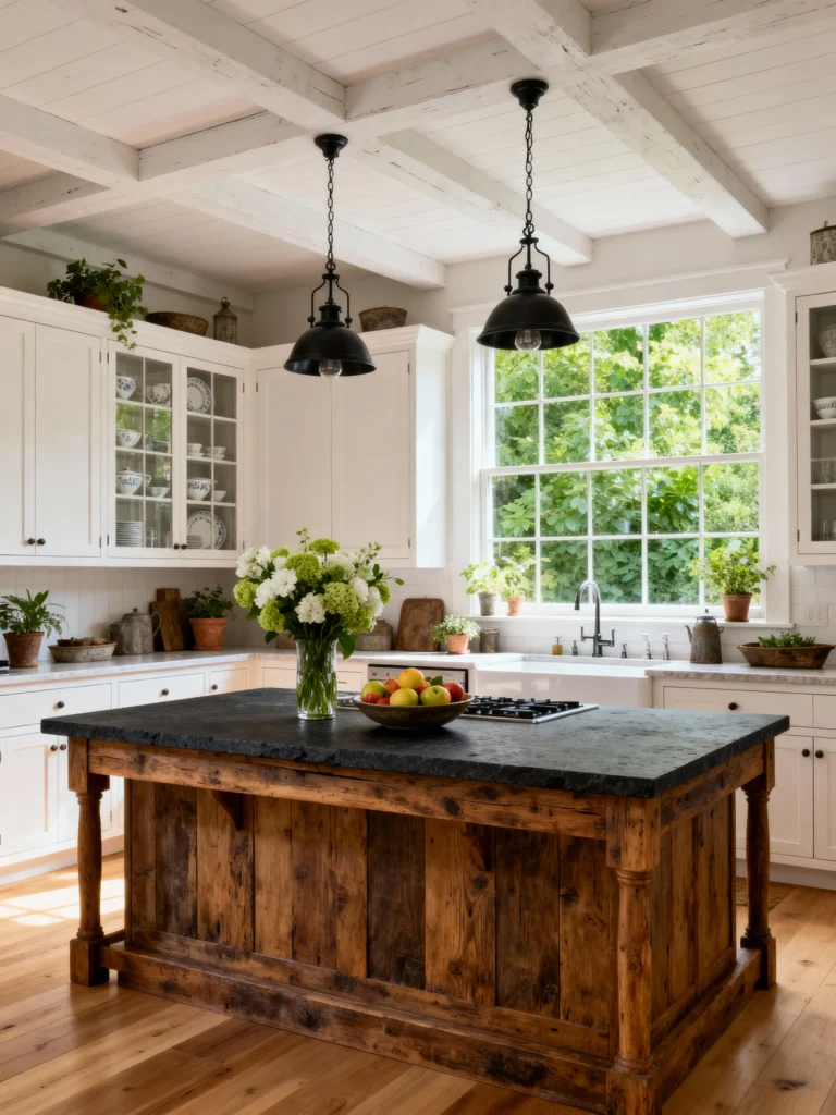 This kitchen is an absolute dream! The chunky, dark wood island with turned legs is a stunning focal point, perfectly contrasted by the bright white cabinetry and shiplap ceiling. I love how the natural wood grain on the floor ties in with the island, giving the room a grounded, cozy feel. The black pendant lights and window frame add a nice touch of modern contrast. Plus, all those green plants just bring everything to life. It feels so welcoming and ready for a big family gathering!