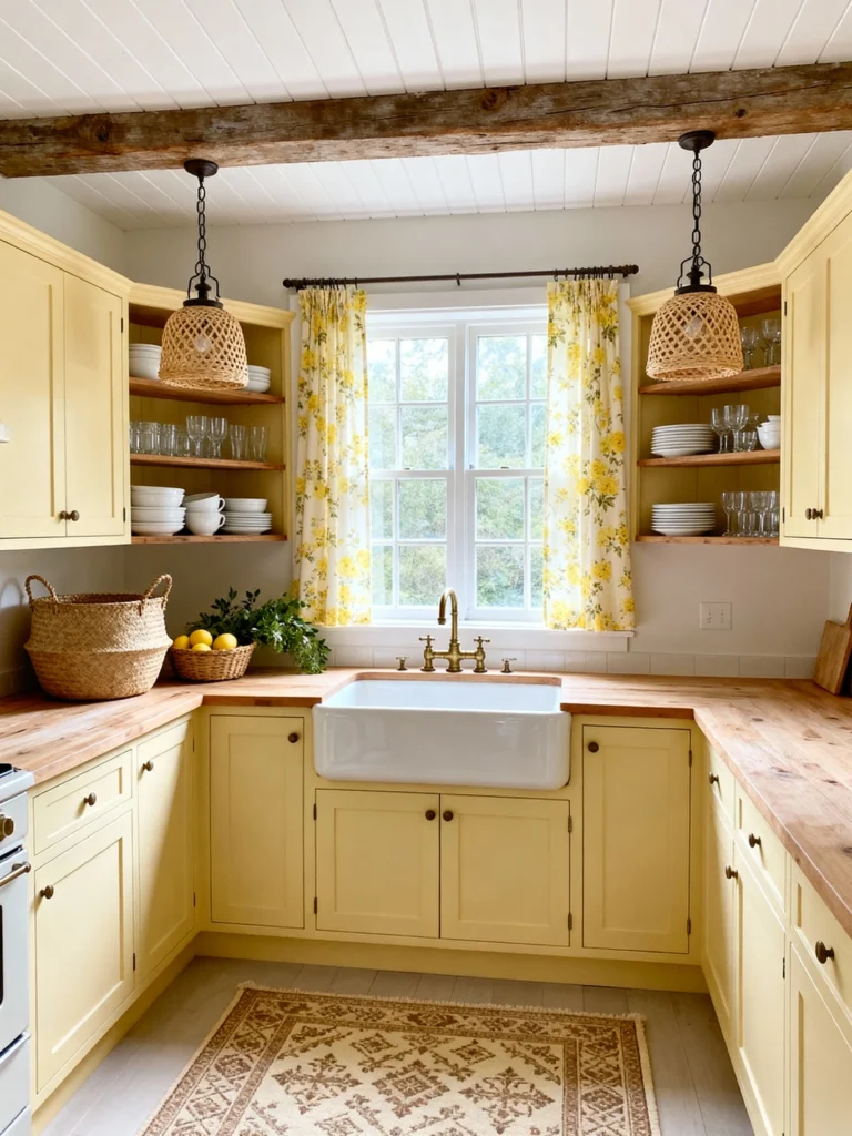 What a sunny and happy kitchen ! The cheerful pale yellow cabinets are such a delightful choice and really brighten up the room. They pair so well with the natural wood countertops and the simple, woven pendant lights. The yellow floral curtains are just the sweetest touch, framing the window beautifully and adding to the cozy, country feel. It feels like the kind of place where you’d bake pies and always have a bowl of fresh lemons ready.