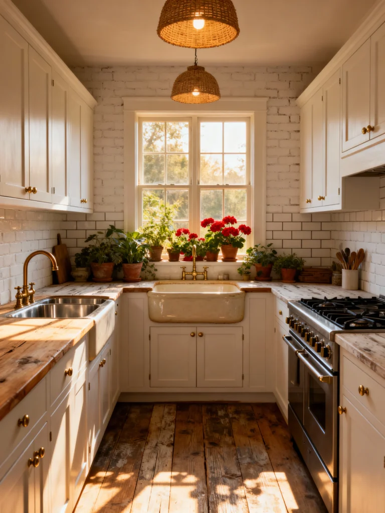 The light in this kitchen is simply magical! Those raw, wide-plank wood floors and the textured white brick backsplash give it a true, authentic farmhouse feel. The combination of the warm wooden countertops and the classic white farmhouse sink is timeless. Look at those charming woven pendant lights! They cast such a lovely, soft glow. And those bright red geraniums on the windowsill? They’re the perfect pop of color against the white. It feels intimate, rustic, and incredibly sunny.