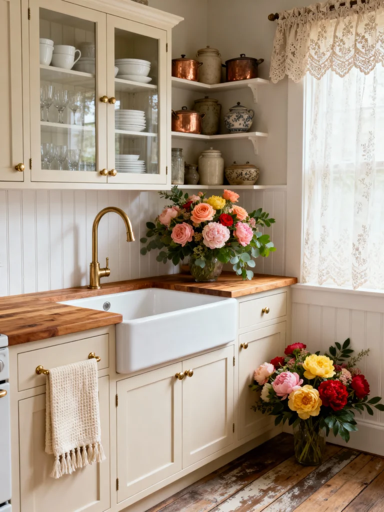 If you’re looking for a touch of sweet, vintage elegance, look no further than this beauty . The creamy cabinets with brass knobs and the glass-front upper cabinet feel so classic and refined. The delicate lace curtain adds a gorgeous layer of softness and light. But let’s be real, the showstopper here is the abundance of lush, colorful roses! Placed by the farmhouse sink and on the counter, they instantly make the whole room feel joyful and incredibly welcoming. The gold faucet is the perfect sophisticated detail.