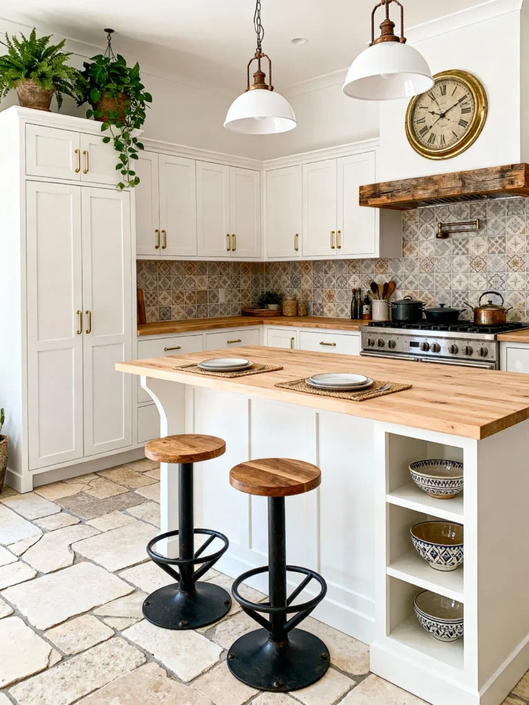 I am completely obsessed with the backsplash in this kitchen ! Those patterned, earthy tiles add so much personality and a lovely Mediterranean vibe, which is a wonderful twist on traditional farmhouse style. The large, white cabinets and island keep the space feeling bright and airy, while the light wood countertop and rustic floor tiles ground the whole look. The gold accents on the hardware and light fixtures tie it all together beautifully. And how cute are those industrial-style bar stools?