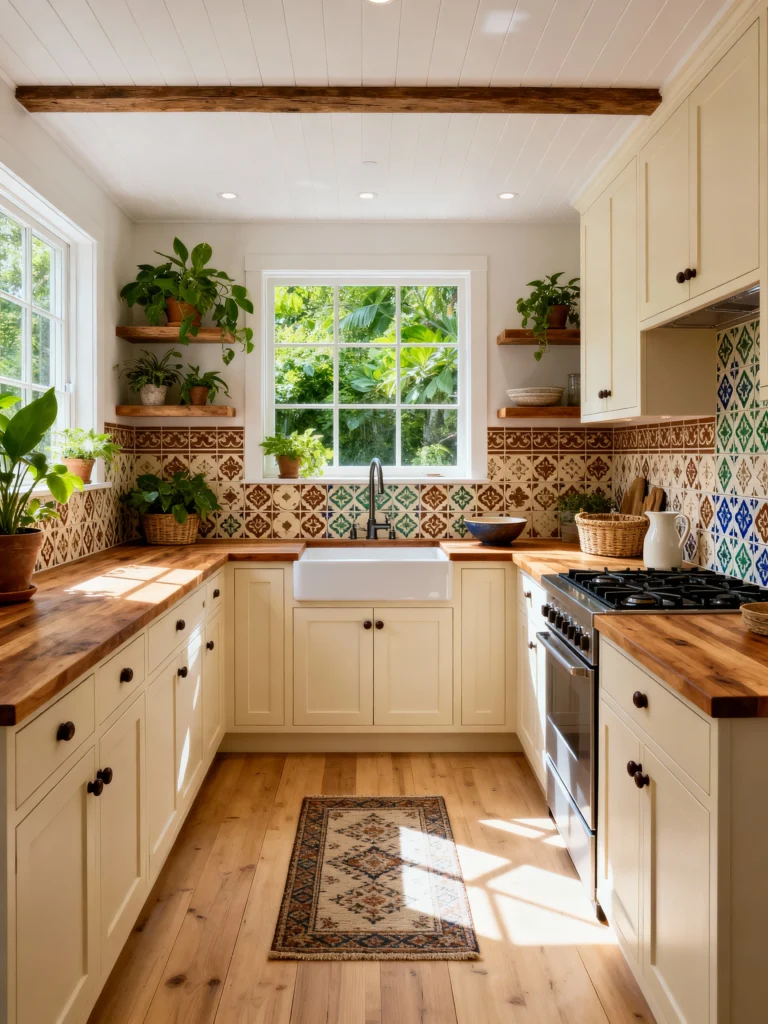 This U-shaped kitchen is a masterclass in bringing the outdoors in! The warm, honey-toned butcher block counters and creamy cabinets create such a beautiful, inviting palette. The detailed, patterned tile backsplash is a fantastic feature, perfectly complementing all the vibrant green houseplants dotted around the shelves and counters. Those exposed wooden ceiling beams add a lovely touch of rustic character. It just feels like a bright, happy space to cook and enjoy nature.