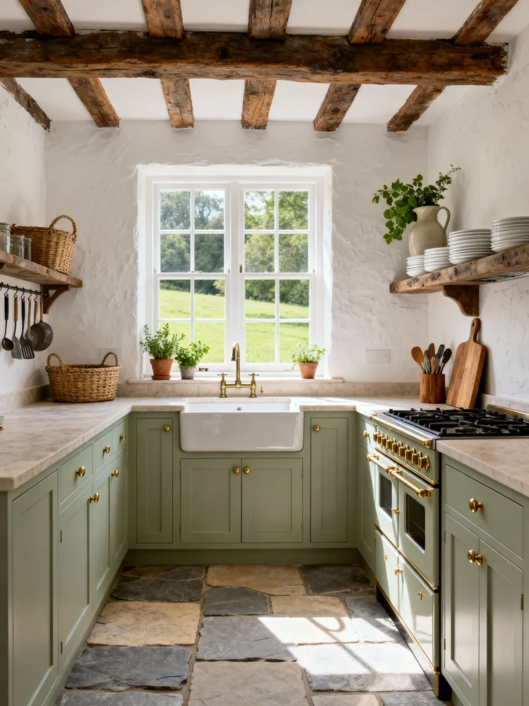 Talk about cozy cottage vibes! This kitchen is dripping with character. The sage green cabinets with brass hardware are an unexpected and sophisticated color choice, pairing perfectly with the natural stone floor. I love the rough, textured white walls and the heavy, dark wooden beams across the ceiling—it gives the room so much incredible texture and history. The deep window sill looking out onto that lush green field is the perfect backdrop for a simple, peaceful morning.