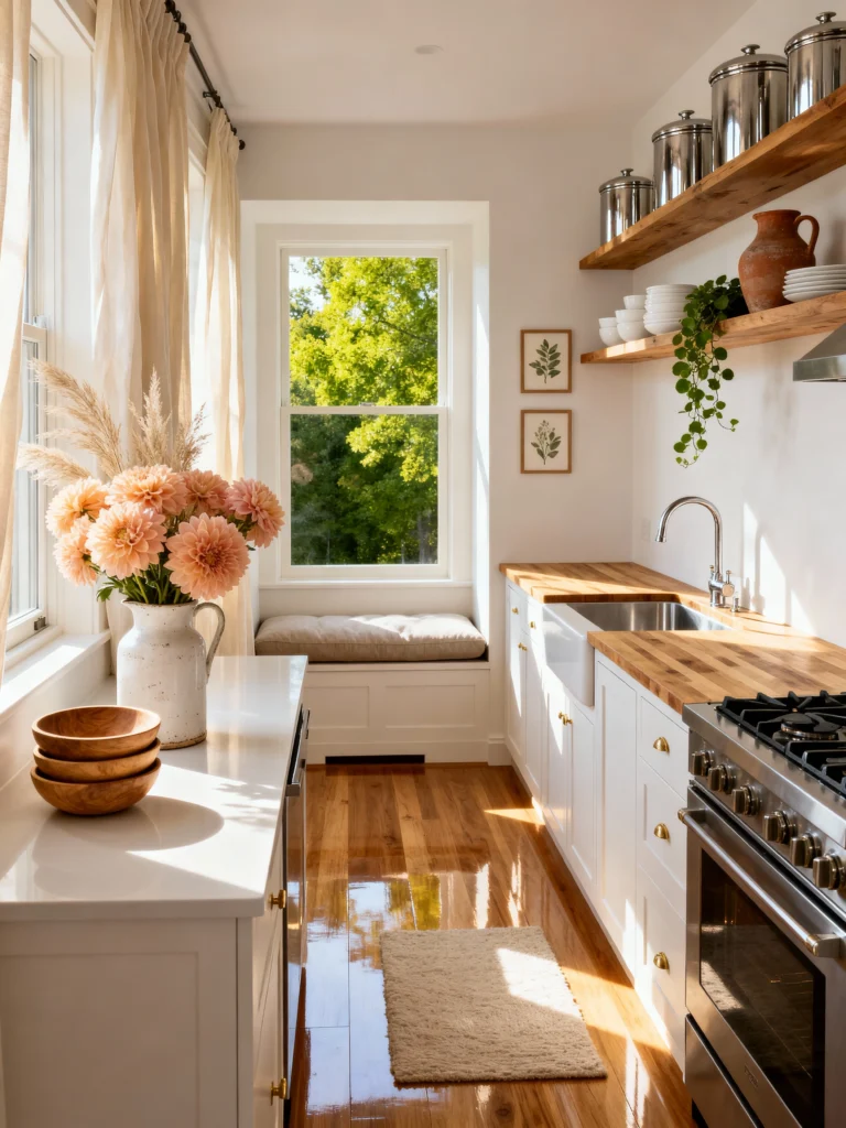 Even a smaller galley kitchen can be absolutely stunning, and this one proves it! The natural light streaming in through the window, highlighting the glossy wood floors, is incredible. The warm wood counters on the bright white cabinets create a perfect contrast. I love the simple, floating wooden shelves for open storage. And can we talk about that window seat? A genius way to add a cozy spot! The bouquet of pale orange flowers adds the perfect touch of soft elegance.