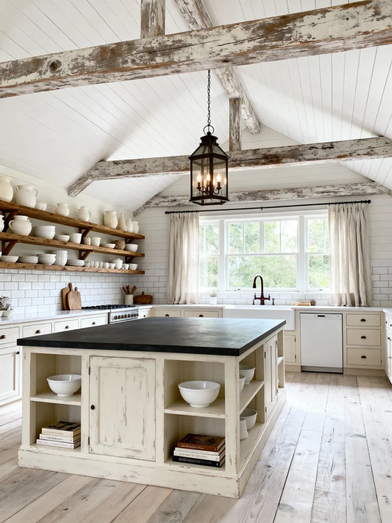 This space is the epitome of rustic elegance! The distressed white wood ceiling and exposed beams, along with the white shiplap walls, create an incredibly bright and airy atmosphere. The open shelving filled with matching white pottery provides a beautiful, curated display that feels both organized and charming. The large island with a dark countertop grounds the space, and the plank wood floors are wonderfully authentic. It’s simple, chic, and beautifully textural.