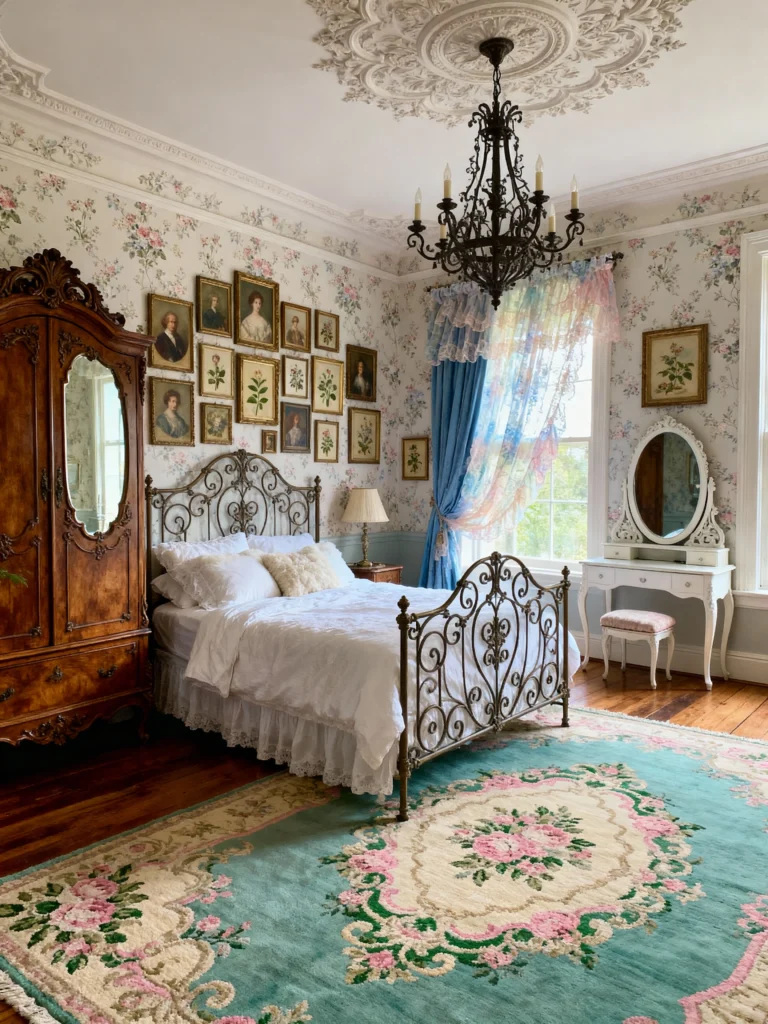 This is an absolutely breathtaking bedroom! The combination of the floral wallpaper, the ornate ceiling medallion, and that dramatic wrought-iron chandelier is pure romance. The antique armoire and dressing table add a beautiful sense of history. My favorite part has to be that huge, luxurious rug in soft teal and pink—it really ties the whole garden-inspired look together. It’s a grand space that still manages to feel incredibly soft and cozy thanks to all the delicate floral patterns!