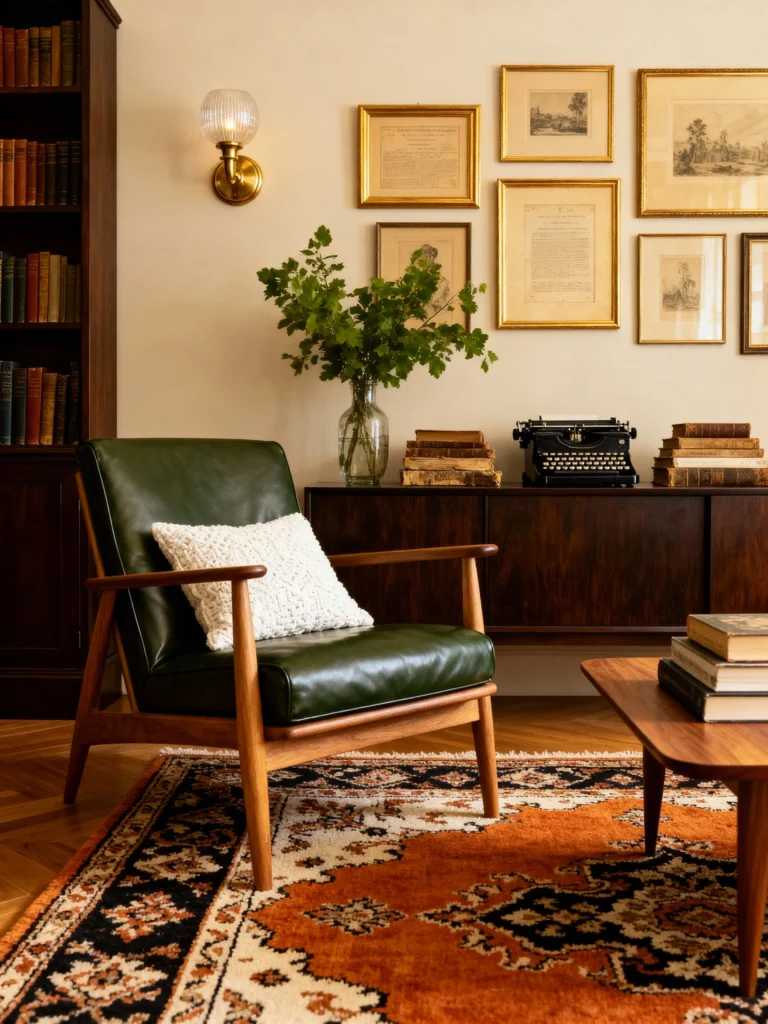 This room has such a sophisticated, scholarly vibe! The deep forest-green leather armchair against the warm wood tones is just stunning—it feels so rich and inviting. The gallery wall of framed vintage prints, all in matching gold frames, adds so much character. I’m also obsessed with the dark wooden credenza holding stacks of books and that old-school black typewriter. It’s the perfect blend of Mid-Century modern lines and classic, intellectual style. Total dream reading spot!