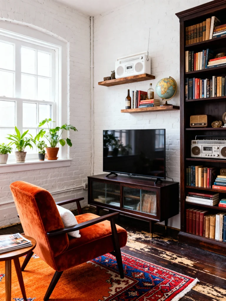 How cool is this little living area? It has a fantastic urban, eclectic feel! I’m immediately drawn to the vibrant orange velvet accent chair—it brings such a warm punch of color against the white-painted brick walls. The built-in dark wood bookcase and the floating shelves are packed with personality, full of vintage radios, books, and globes. It’s the perfect mix of textures and colors, creating a very curated, cozy, and slightly retro reading/TV nook.