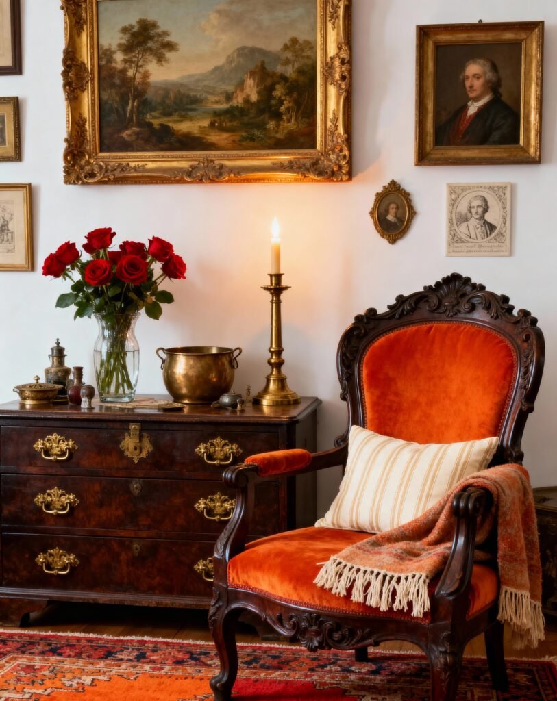This photo is packed with rich color and luxurious texture! The deep, orange-red velvet armchair is an absolute showstopper, looking incredibly plush and inviting. It pairs so well with the dark antique dresser, especially with all the sparkling brass hardware. The classical artwork on the wall and the vibrant rug underneath really emphasize the dramatic, maximalist style. It’s a fantastic example of using saturated color to create a truly warm and memorable space.