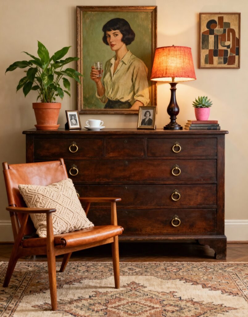 Isn’t this corner beautiful? Everything here feels collected and personal. That deep, dark wooden chest of drawers with the brass ring pulls is a gorgeous anchor for the space. I’m captivated by the painting hanging above—it’s got such a striking, vintage quality. Paired with the smaller, textured leather chair and that patterned cushion, the whole setup is so inviting. It’s a lovely, intimate spot that proves you don’t need a lot of space to create a huge impact!