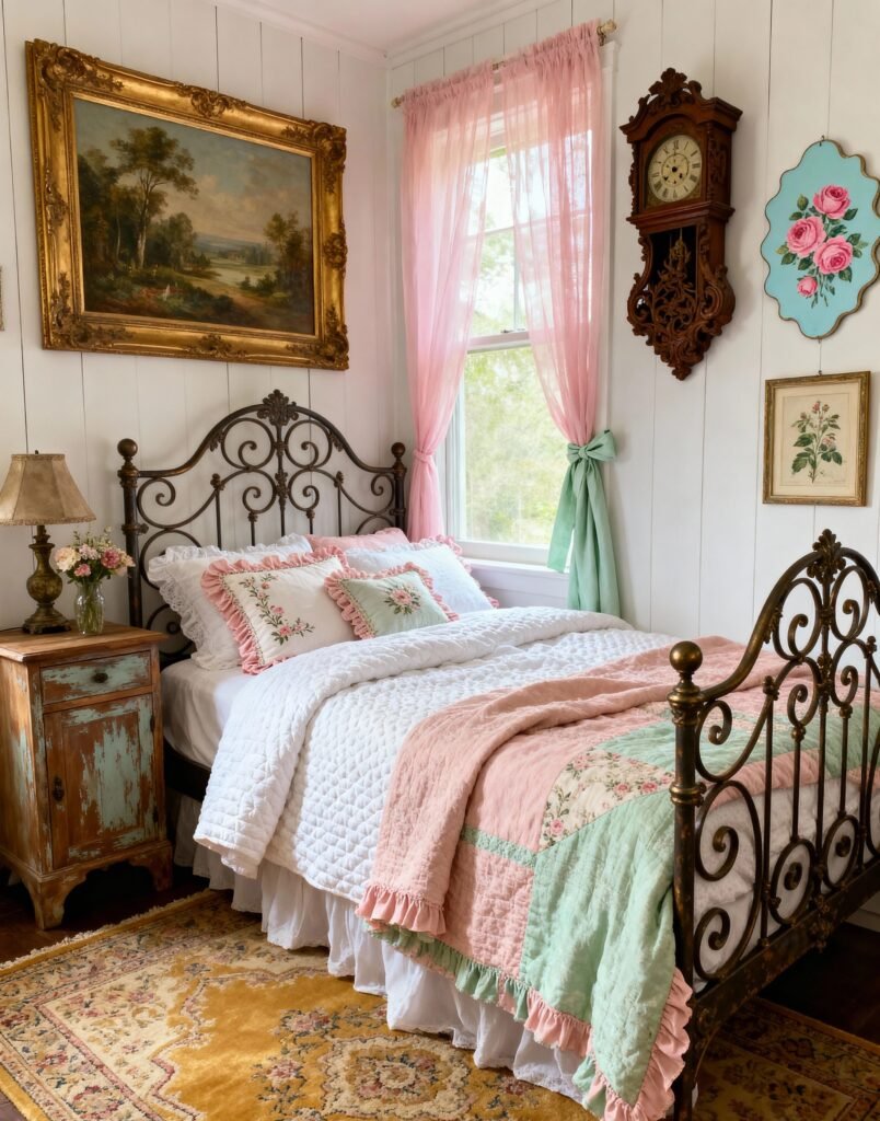 This space is pure, delightful Shabby Chic. That wrought-iron bed frame with the scrollwork is so romantic, and the pops of pink and mint green in the ruffled quilt and pillows are just so sweet. I especially love the vintage details, like the beautifully distressed bedside table and the dramatic wall clock. And those sheer pink curtains? They let in the light so softly. It’s a wonderfully feminine and nostalgic retreat!