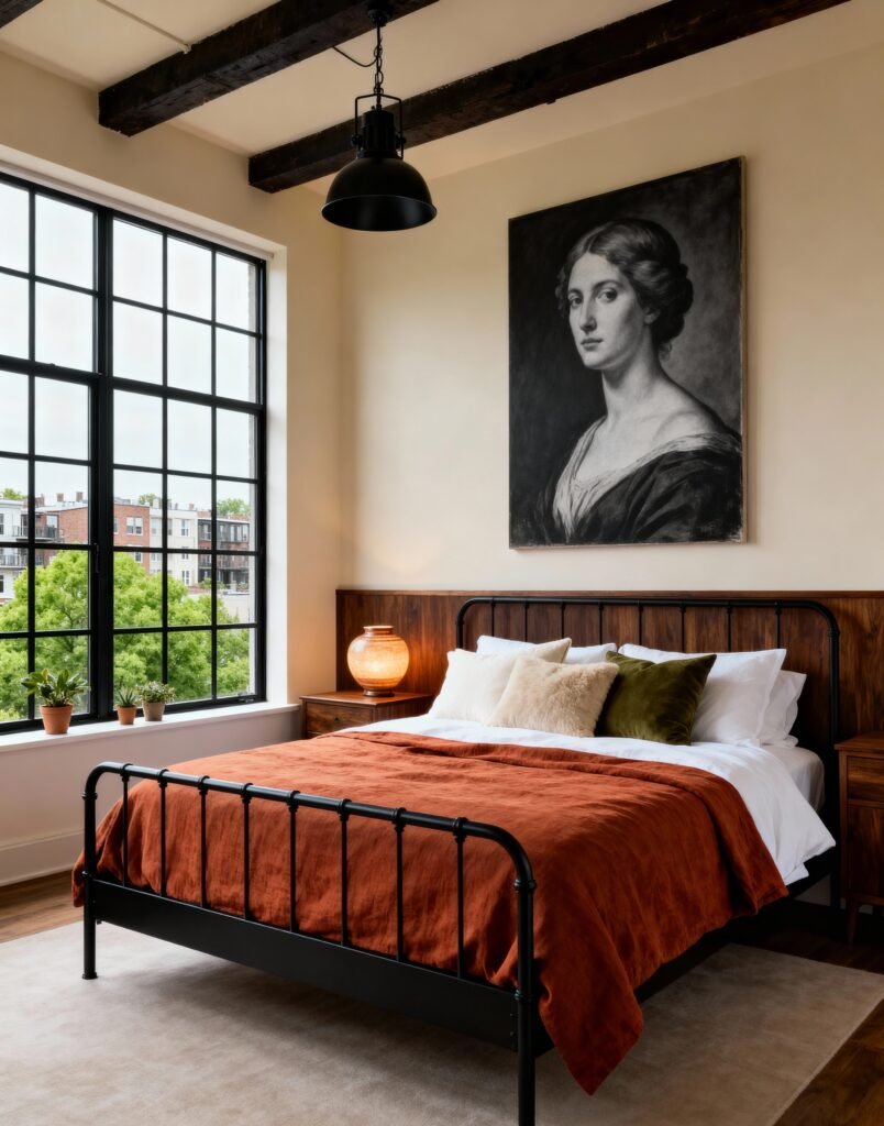 I love the mix of styles in this bedroom! The exposed ceiling beams and that huge, multi-pane black window give it a cool, slightly industrial edge, which is softened beautifully by the warm wooden headboard and the earthy terracotta bedding. The simple color palette—creamy walls, dark wood, and pops of rust and olive—feels very calming and grown-up. And that oversized black and white portrait above the bed? It adds a dramatic, timeless touch.