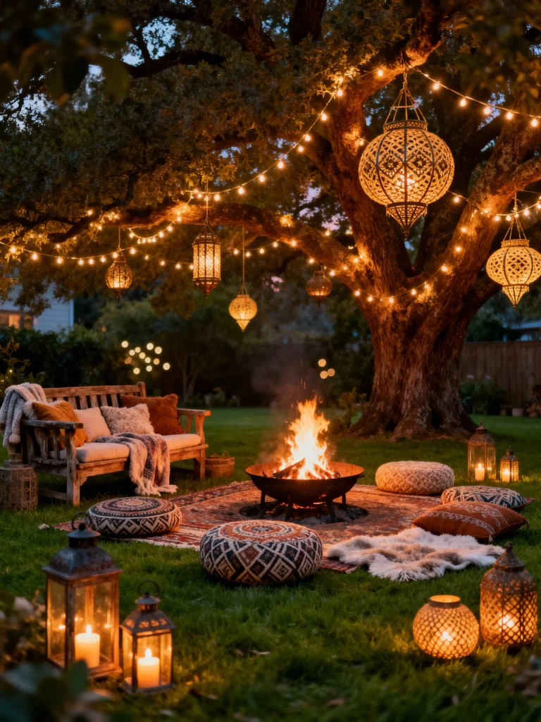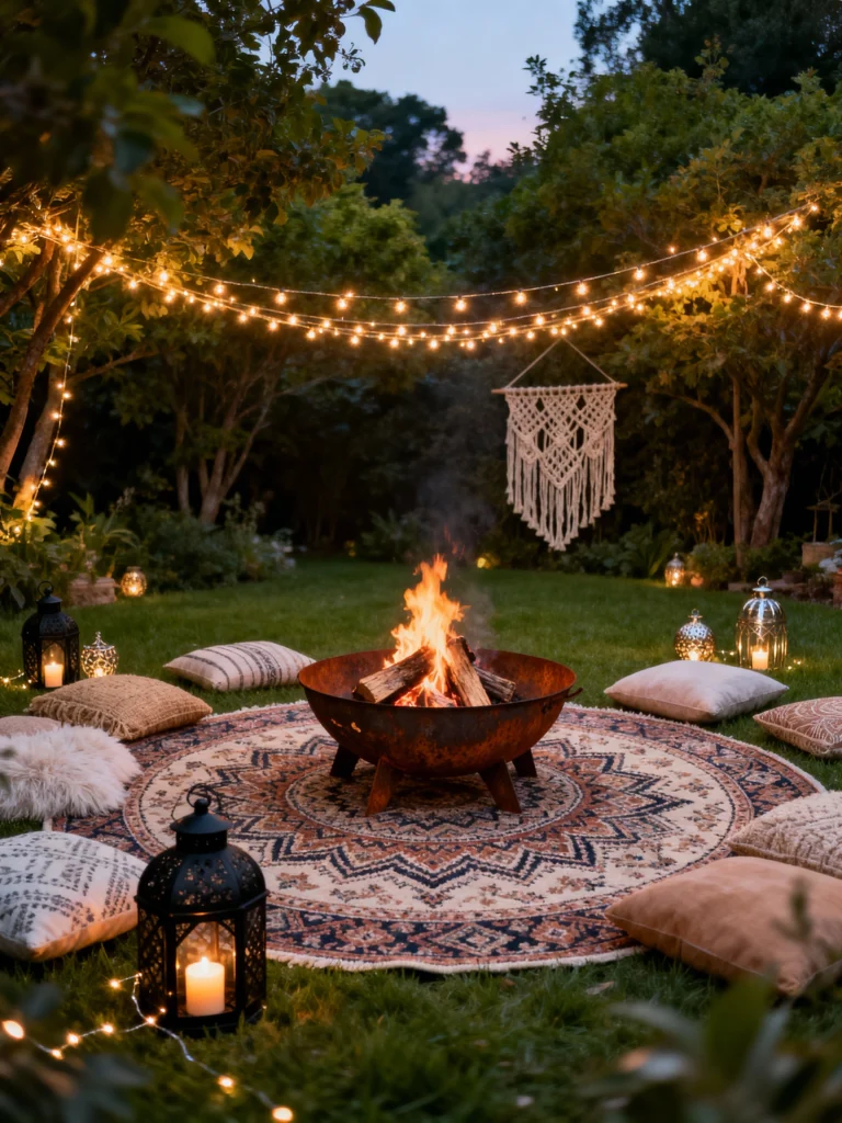 This scene just feels so relaxed and free-spirited, doesn’t it? The worn, rustic fire bowl is the perfect centerpiece for a casual, comfortable gathering. Instead of formal seating, they’ve layered a gorgeous patterned rug with a mix of cozy floor cushions and pillows. With the twinkle lights strung overhead and those beautiful lanterns scattered around, it’s the ideal spot for long talks under the stars. That macramé wall hanging adds such a lovely, handcrafted touch.
