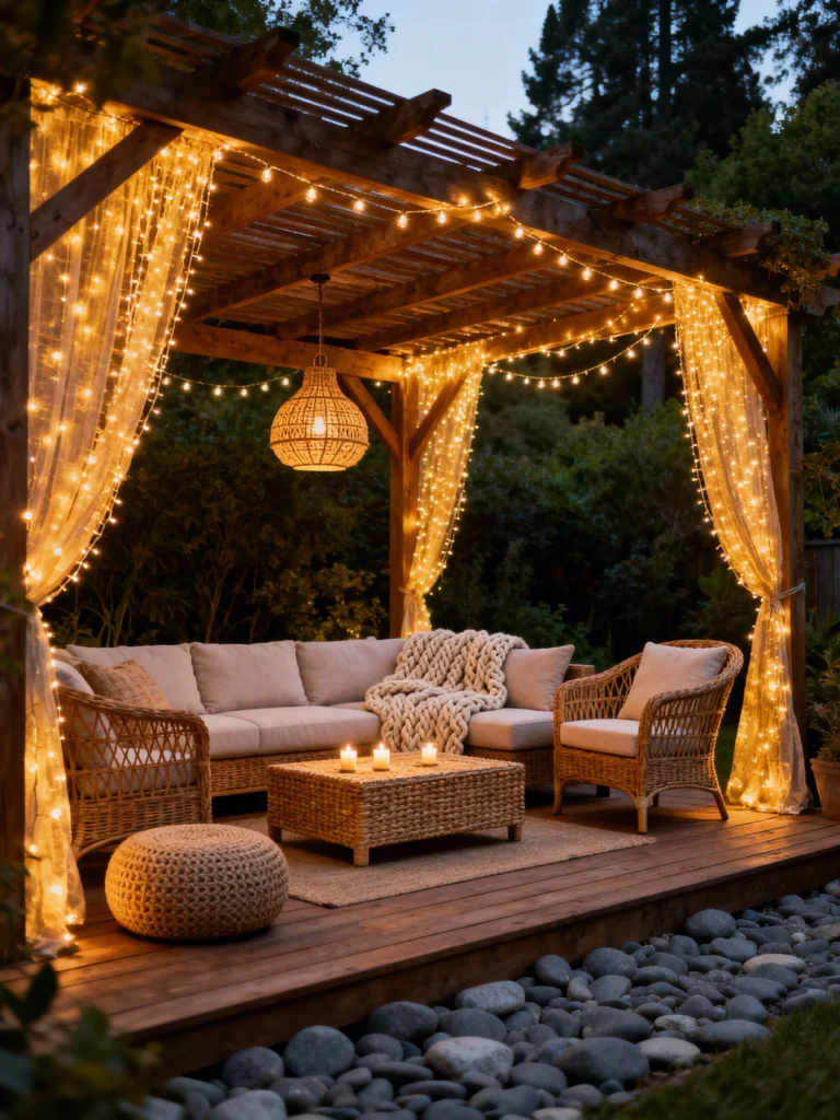 This pergola setup is all about creating an outdoor ‘room.’ The sheer, curtain-like fairy lights draped along the sides make the space feel incredibly enclosed and magical at night. The comfy sectional sofa and woven wicker chairs provide plenty of seating, while the hanging wicker pendant light over the coffee table acts as a beautiful statement piece. It’s an elevated, intimate space perfect for unwinding after a long day.