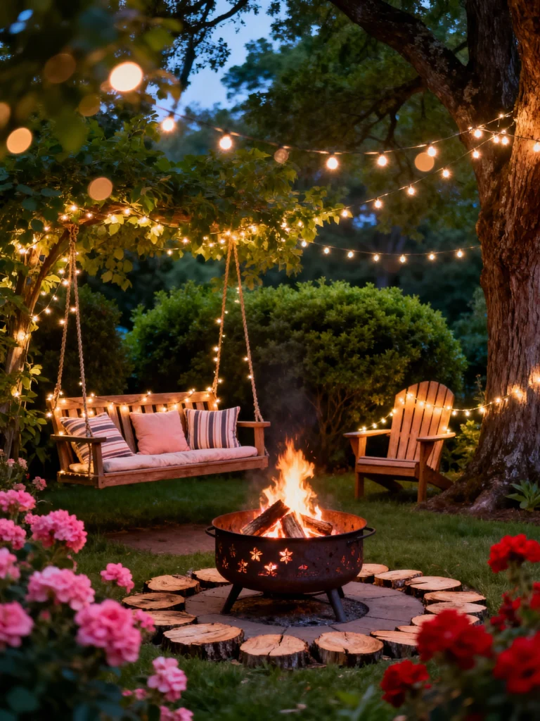 Seriously, how stunning is this scene? It’s pure evening enchantment! The key here is definitely the layering of light. Those twinkling string lights draped over the trees instantly create an intimate, almost fairy-tale atmosphere. Check out that super cozy wooden porch swing, piled high with comfy cushions—it’s just begging you to curl up with a blanket and a good book. And of course, the heart of the space: that beautiful fire pit! Surrounded by rustic log slices, it’s the perfect spot for roasting marshmallows and sharing stories. The mix of lush greenery and vibrant pink roses framing the area just ties the whole romantic look together. This is the ultimate backyard hangout goal!