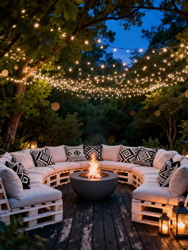 This massive curved seating area, built from wooden pallets, proves that chic design doesn’t have to break the bank. The bright white cushions and bold, black-and-white patterned pillows give it a modern, dramatic look against the dark wood deck. Stringing up multiple layers of fairy lights over the top creates that wonderful, magical canopy effect. The sleek, round fire bowl in the center keeps everyone warm and creates a stunning focal point.