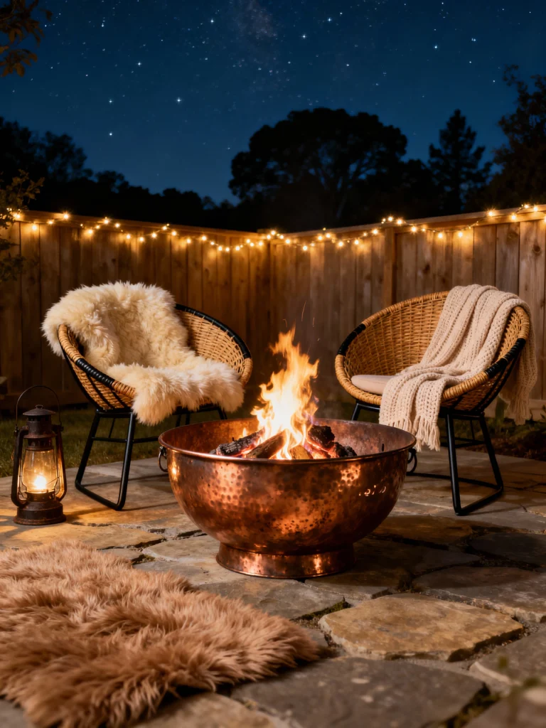 This one is pure rustic luxury! That hammered copper fire pit is an absolute showstopper, adding instant warmth and texture to the stone patio. The simple seating arrangement—two gorgeous wicker chairs—is elevated with those shaggy, cream-colored faux fur throws and a chunky knit blanket. It feels intimate and super cozy, perfect for a couple’s evening under the starry sky, especially with that vintage lantern adding an extra layer of ambient light.