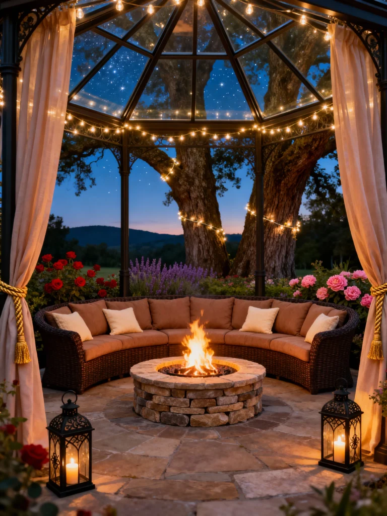 This space is next-level romance! Setting a stone fire pit and curved wicker seating inside a beautiful glass gazebo, surrounded by lush pink and red roses? It’s pure fairytale. The heavy, draped curtains add a touch of privacy and elegance, while the structure lets you enjoy the landscape and even a peek at the stars. The classic black lanterns flanking the entrance complete this incredibly luxurious, protected outdoor retreat.