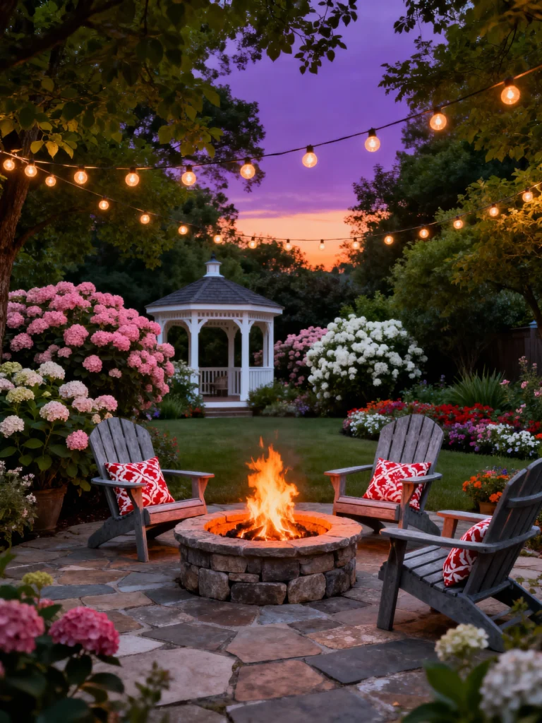 This is the quintessential charming garden retreat! The classic Adirondack chairs, painted a nice weathered grey, surround a stacked stone fire pit, creating a casual and inviting circle. But the real stars are those incredible hydrangeas and the colorful flower beds—it’s a vibrant and lively space. The glow of the bistro lights and that stunning pink and purple sunset view really seal the deal on this peaceful, relaxing setup.