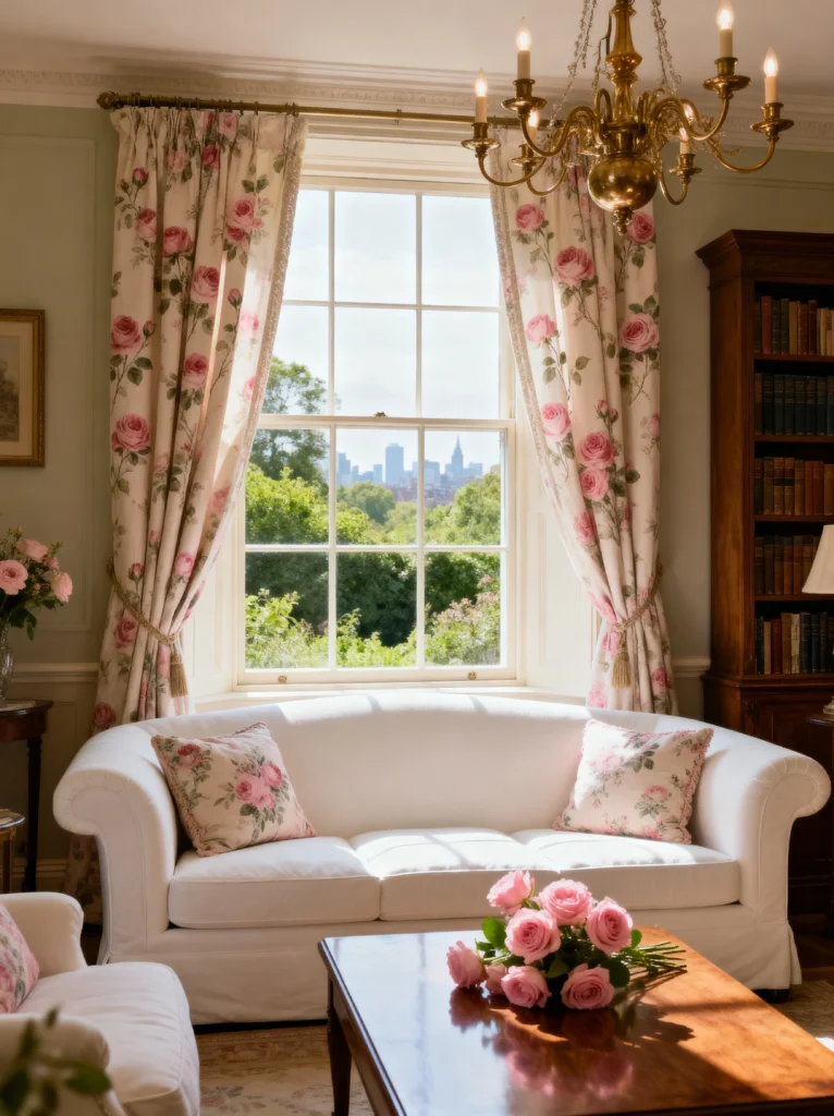 Have you ever wanted to feel like royalty without actually having to deal with the paparazzi? This look is exactly that. We’ve got these stunning, heavy cream curtains absolutely blooming with pink roses. They have that classic English Countryside vibe, but then you look out the window and—boom—there’s the city skyline!