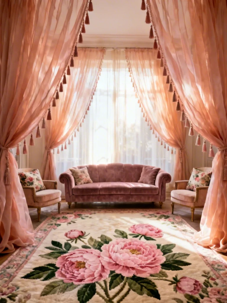 Okay, can we just take a second to appreciate the absolute drama of this room? This isn’t just a living room; it’s a mood. If you’re a fan of the “Coquette” or “Grandmillennial” aesthetic, this is your dream come true. The sheer, dusty-rose curtains are draped so generously they almost look like a canopy bed, and those tiny tassels lining the edges? Pure magic.