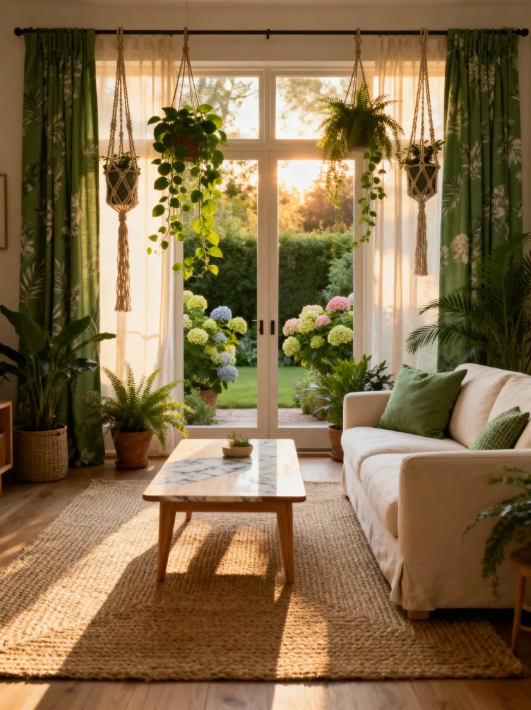 For my fellow “plant parents” out there, this one is for you! If you can’t decide between curtains and more plants, why not both? This room uses window treatments to create a literal indoor jungle. The deep forest-green curtains with white leaf prints pull the colors of the garden right inside, making the room feel twice as big.