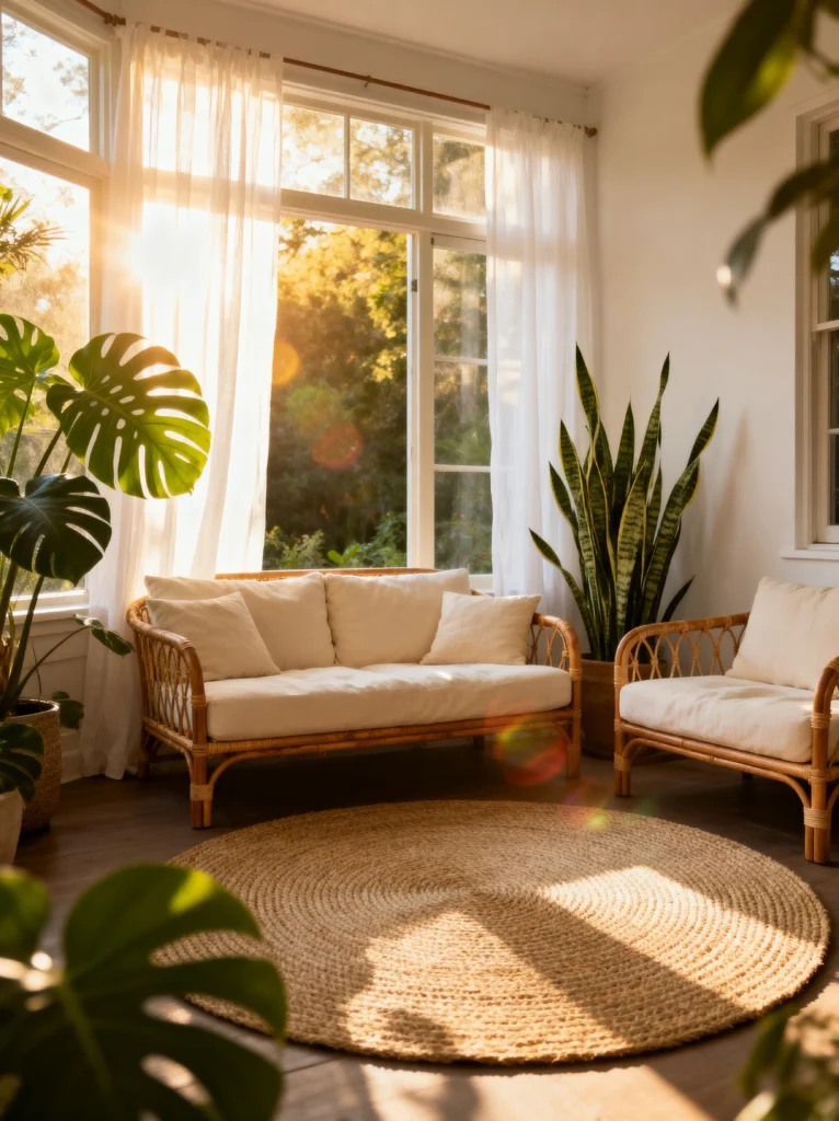 This style is perfect for a sunroom or a bright living area where you want privacy without sacrificing that golden-hour glow. The round jute rug and the rattan furniture give it a very organic, grounded feel. It’s simple, clean, and totally clutter-free. It’s the kind of room that makes you want to wake up early, do some yoga, and actually enjoy your morning coffee instead of rushing out the door. It’s pure, unadulterated peace.