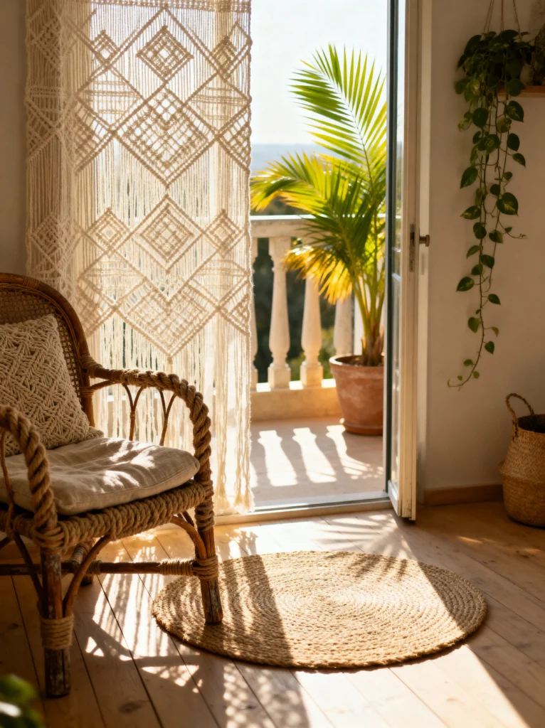 Can we talk about how cool macramé curtains are? Instead of a solid piece of fabric, you’ve got this intricate, knotted masterpiece. This is a total game-changer for a balcony door. It doesn’t block the view or the breeze, but it adds this incredible geometric pattern to the room.