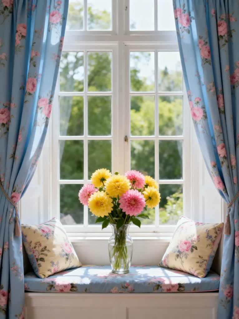 Matching the cushion fabric to the curtains is a classic design trick that makes a space feel high-end and custom-made. The yellow and pink dahlias in the center just tie the whole color palette together. This is the ultimate “reading nook.” I can imagine curling up there on a rainy afternoon with a thick book and a blanket. It’s a small space, but the bold floral patterns make it feel like its own little world.