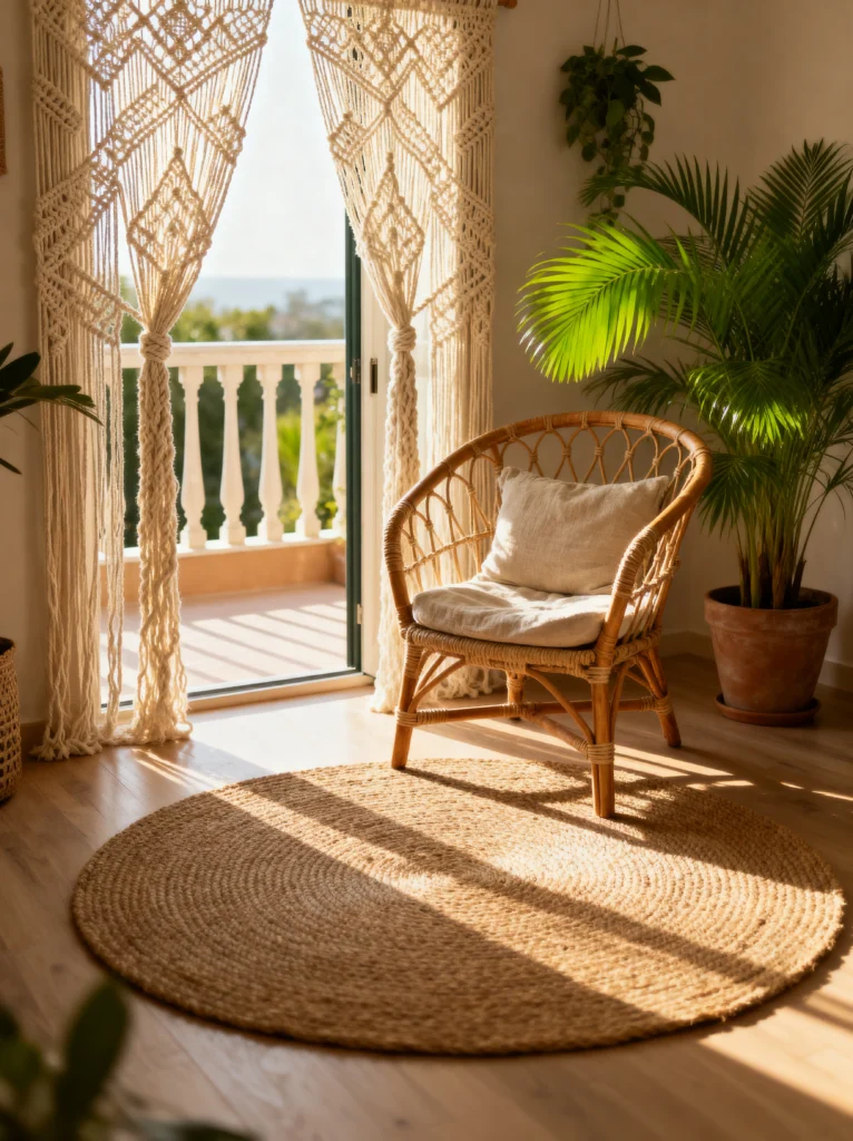 In this shot, the way the sunlight casts shadows of the knots onto the wooden floor is just… chef’s kiss. It turns the light itself into decor! Paired with a rope-wrapped chair and a little round rug, the whole vibe is “Mediterranean vacation.” It’s relaxed, textured, and feels very intentional. If you have a doorway that feels a bit “naked,” a macramé panel is a great way to add character without the heaviness of a traditional curtain.