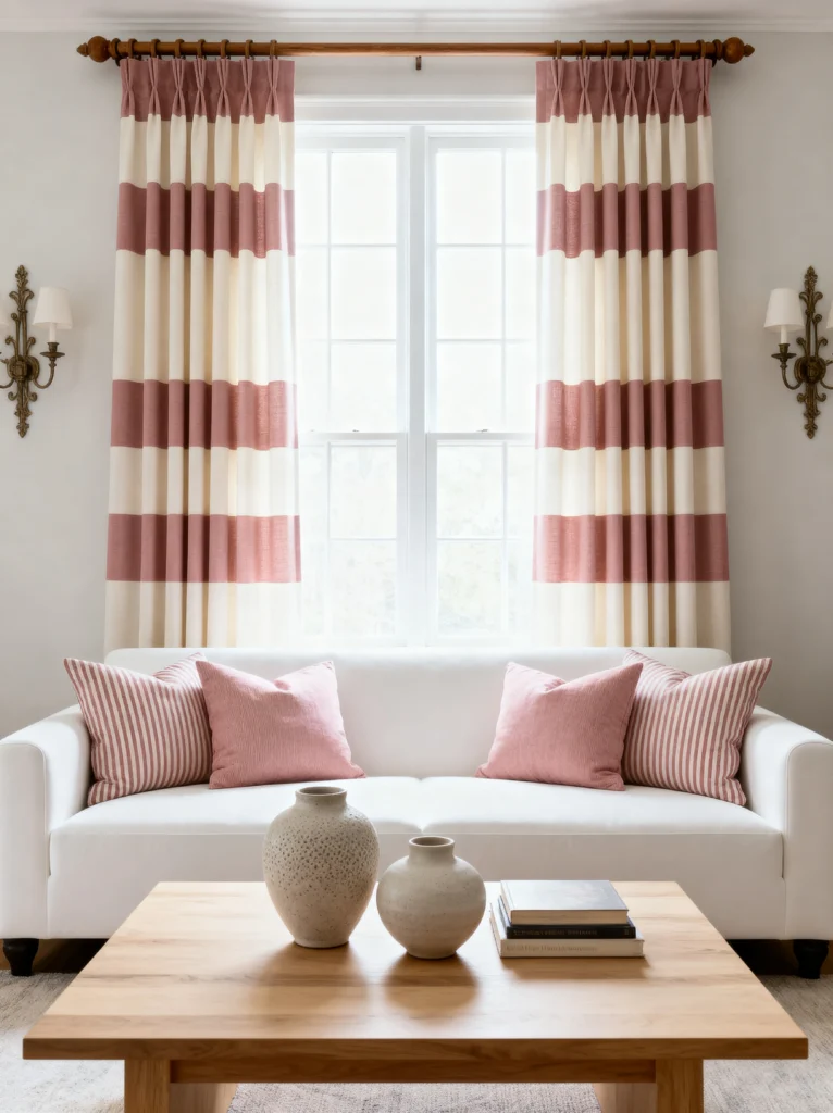 Finally, let’s talk about something a bit more structured. Stripes are a classic for a reason—they never go out of style. These wide, horizontal “dusty rose” and cream stripes are so sophisticated. They add height to the room and provide a great backdrop for that crisp white sofa.