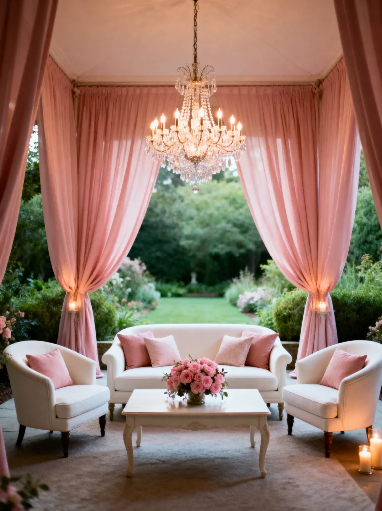 Okay, this one is pure magic. Imagine hosting a twilight dinner party here! We’ve moved outside (or into a very breezy sunroom), and the vibe is total “enchanted evening.” Instead of heavy drapes, we’re using sheer, floor-to-ceiling pink fabric to create this ethereal canopy.