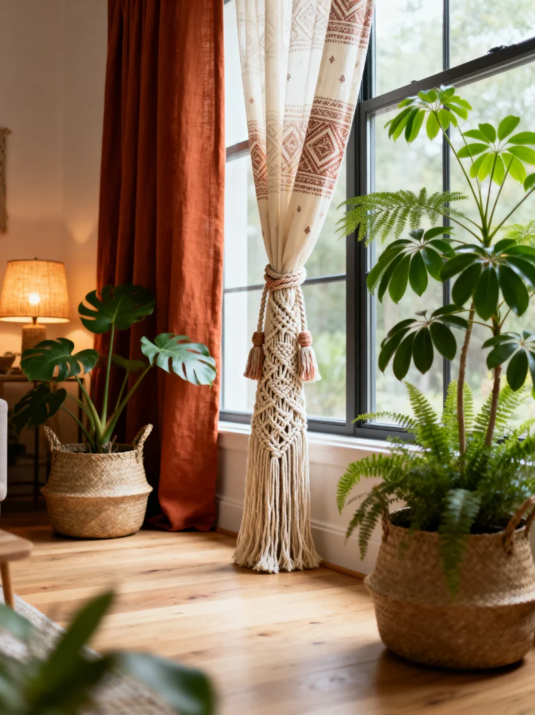 If you want your home to feel like a warm hug, look no further. This setup is all about those rich, “burnt orange” sunset tones paired with creamy textures. What I love most here is the layering. You’ve got that heavy, rust-colored linen drape that feels super grounded, and then—the star of the show—that macramé tie-back. It’s such a clever way to add a handmade, artisanal touch without going full “hippie.”