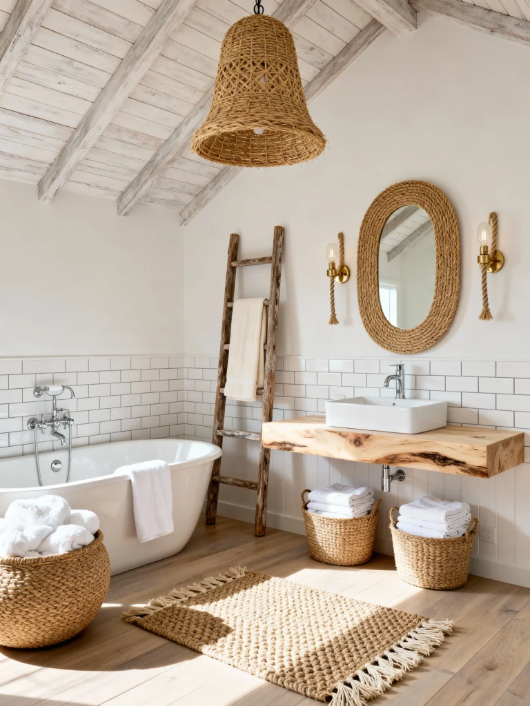 If you love the look of a weathered pier or a secluded beach shack, this is for you. The first thing that catches my eye here is that incredible vaulted ceiling with the exposed white-washed beams. It makes the whole room feel so airy! The use of raw, natural wood—like that chunky floating vanity and the driftwood ladder—adds so much soul. And can we talk about that rope-wrapped mirror? It’s such a simple DIY-inspired touch that ties the nautical theme together without feeling cheesy. This space proves that “coastal” can be warm, earthy, and totally grounded.
