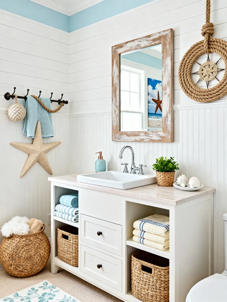 There is something so crisp and clean about white shiplap, isn’t there? This look is perfect if you want your bathroom to feel bright and organized. I love how the white vanity features open shelving for those woven baskets—it’s a great way to hide the clutter while adding texture. The little pops of blue in the towels and that subtle light blue trim near the ceiling give it just enough color. Plus, the starfish on the wall and the rope knot art are such cute, friendly nods to the sea. It’s a classic look that never goes out of style.