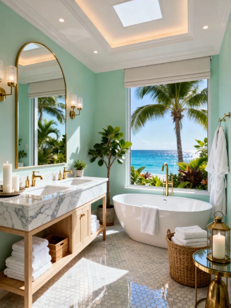 Okay, stop everything—look at that view! Even if you don’t have a literal palm tree outside your window, you can recreate this high-end resort feeling. The mint green walls are so refreshing and pair beautifully with the gold hardware. It feels very “Boutique Hotel in the Caribbean.” The marble countertop adds a touch of sophistication, while the large soaking tub is basically begging for a bubble bath. It’s bright, glamorous, and feels like a total escape from reality. Who wouldn’t want to get ready here every morning?