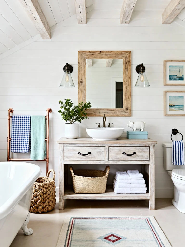 I like to call this “Coastal meets Country.” It has all the bones of a rustic farmhouse—the distressed wood vanity, the copper towel rack, and the white shiplap—but it’s dressed up for the beach. The blue and white checkered towels give it a bit of a “picnic by the shore” vibe. It feels very lived-in and comfortable. It’s the kind of bathroom where you don’t have to worry about being too precious; it’s meant to be used and enjoyed. That little ceramic pig on the counter adds such a fun, quirky personality!