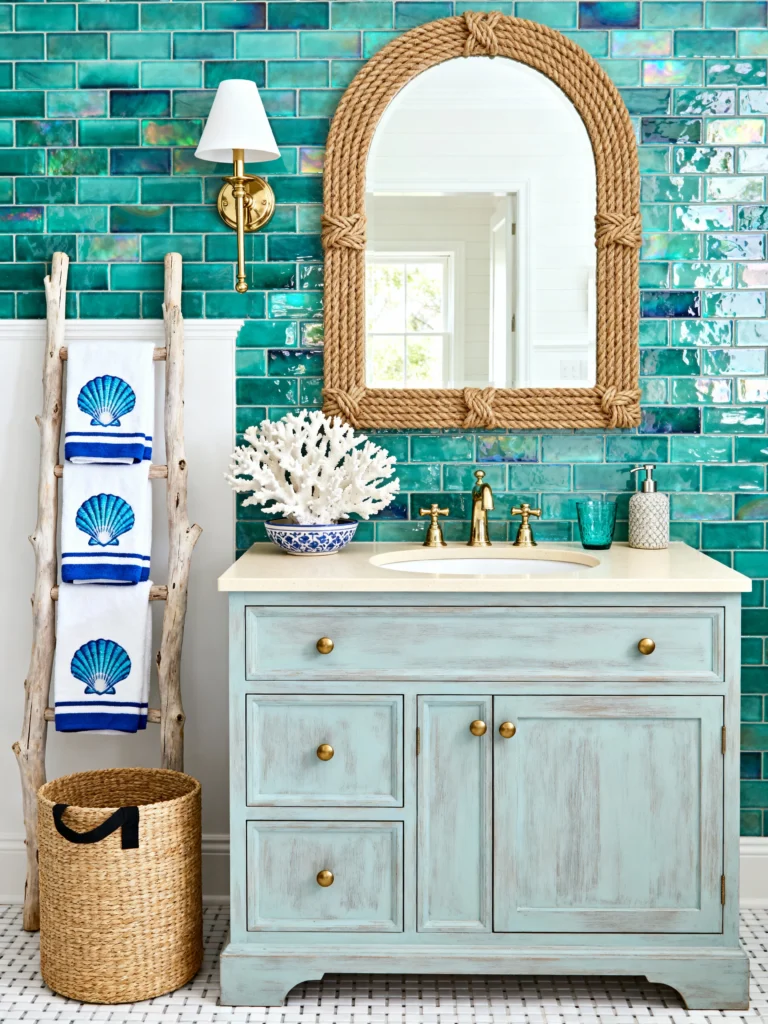 This one is for the true beachcombers! If you’re the person who comes home from vacation with a pocket full of shells, you’ll appreciate this mirror frame. It’s a total statement piece. By surrounding the mirror with starfish and various shells, it turns a functional item into a work of art. I also really like the small teal mosaic tiles in the background—they remind me of sunlight hitting shallow water. Adding a lantern with a candle on the counter is a genius move for creating a relaxing, “spa-night” ambiance.