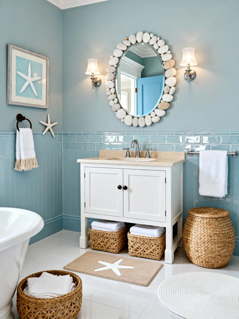This bathroom feels so soft and serene. The star of the show is definitely that oval mirror framed with smooth white river pebbles—it adds such a cool, tactile element to the wall. The soft dusty-blue walls and matching wainscoting keep things feeling calm and cohesive. I also love the little starfish details, from the framed art to the rug on the floor. It’s a very coordinated look that feels intentional and peaceful. It’s exactly where I’d want to wind down after a long, stressful day.