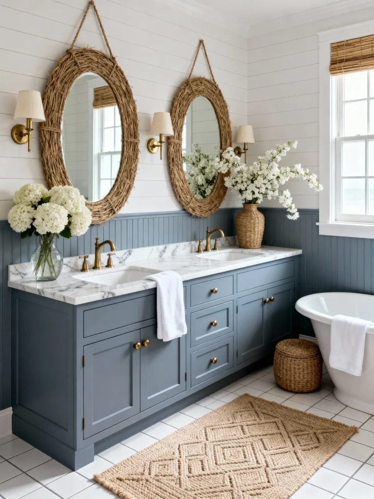 If you want something a bit more “preppy” or sophisticated, this navy and white combo is a winner. The dark blue vanity and wainscoting feel very “Hamptons chic.” Using double mirrors with thick rope frames is a great way to fill a large wall and keep the nautical theme front and center. The white marble top keeps the dark blue from feeling too heavy. It’s a very elegant, symmetrical design that feels high-end but still very much connected to the seaside theme.