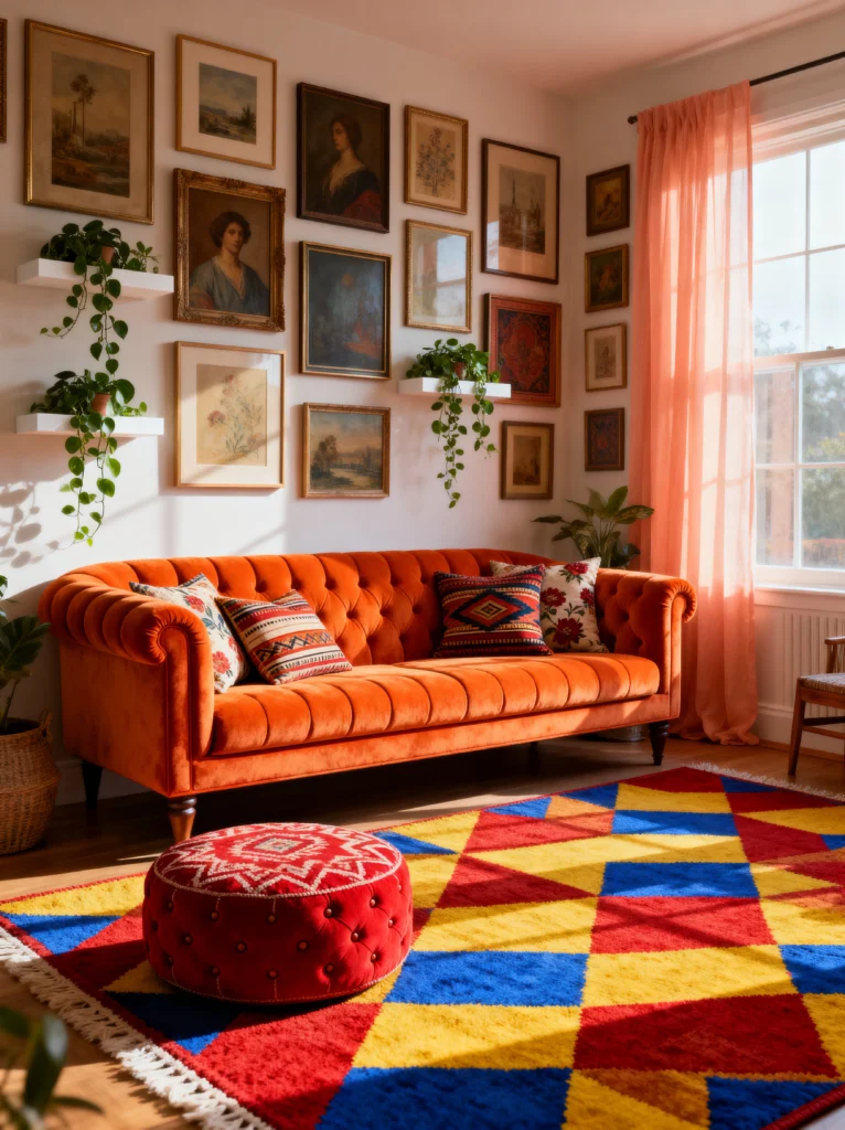 Can we just take a second to appreciate this orange velvet sofa? It’s like sitting on a literal cloud of sunset. What I love about this space is how it feels like a cozy museum. You’ve got this incredible gallery wall that doesn’t care about being “perfect”—some frames are ornate gold, others are simple wood, and they’re all coexisting beautifully.