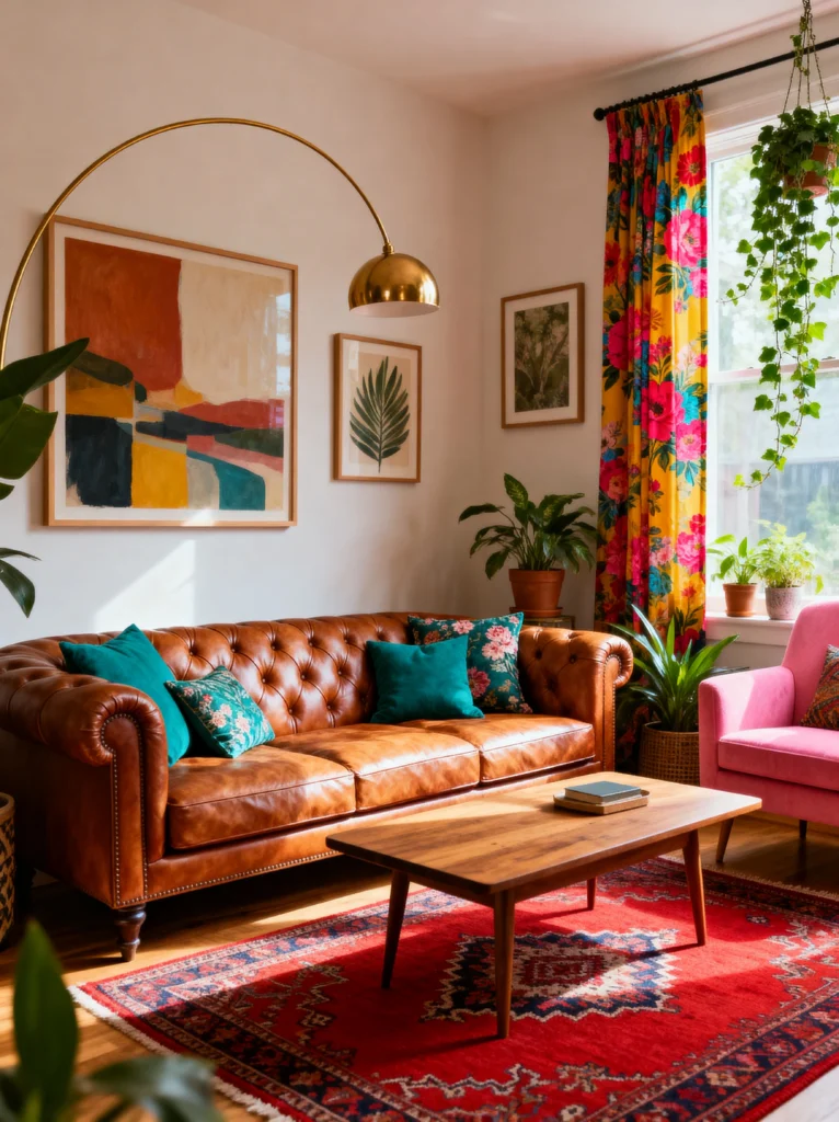 The lighting here is a total mood-setter. That arched gold floor lamp adds a bit of Mid-Century flair without being too over-the-top. And can we talk about those floral curtains? Against the white walls, they act like a piece of art themselves, pulling in the pinks and yellows from the rug and the armchair. It’s a perfect example of how you can mix a traditional piece (like the sofa) with really vibrant, eclectic accents to create a space that feels curated but not stuffy.